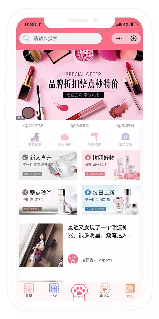 wupoos是一个以美妆为主,集个护、小家电、母婴生活、生活日用等类目为一体的购物分享平台